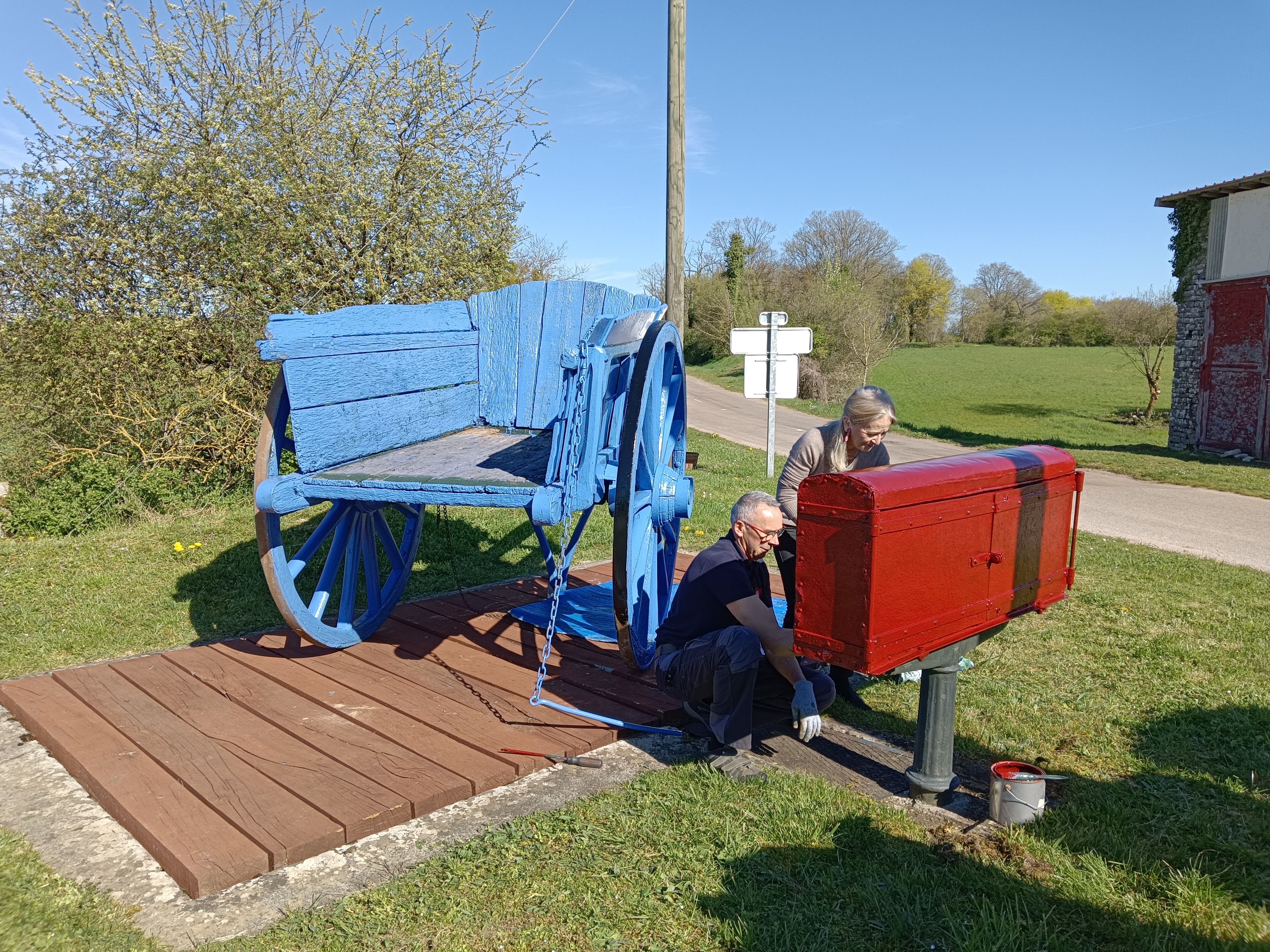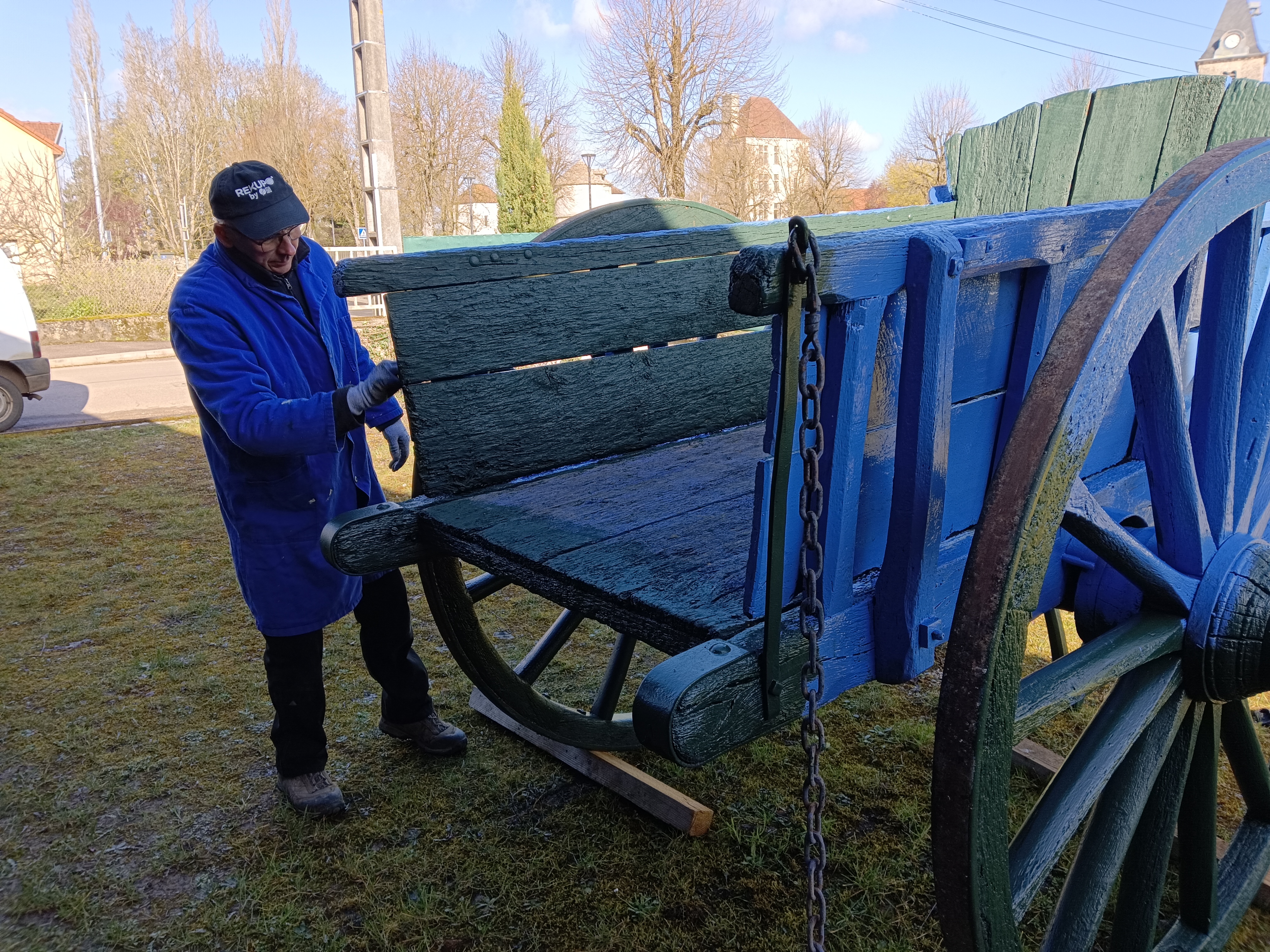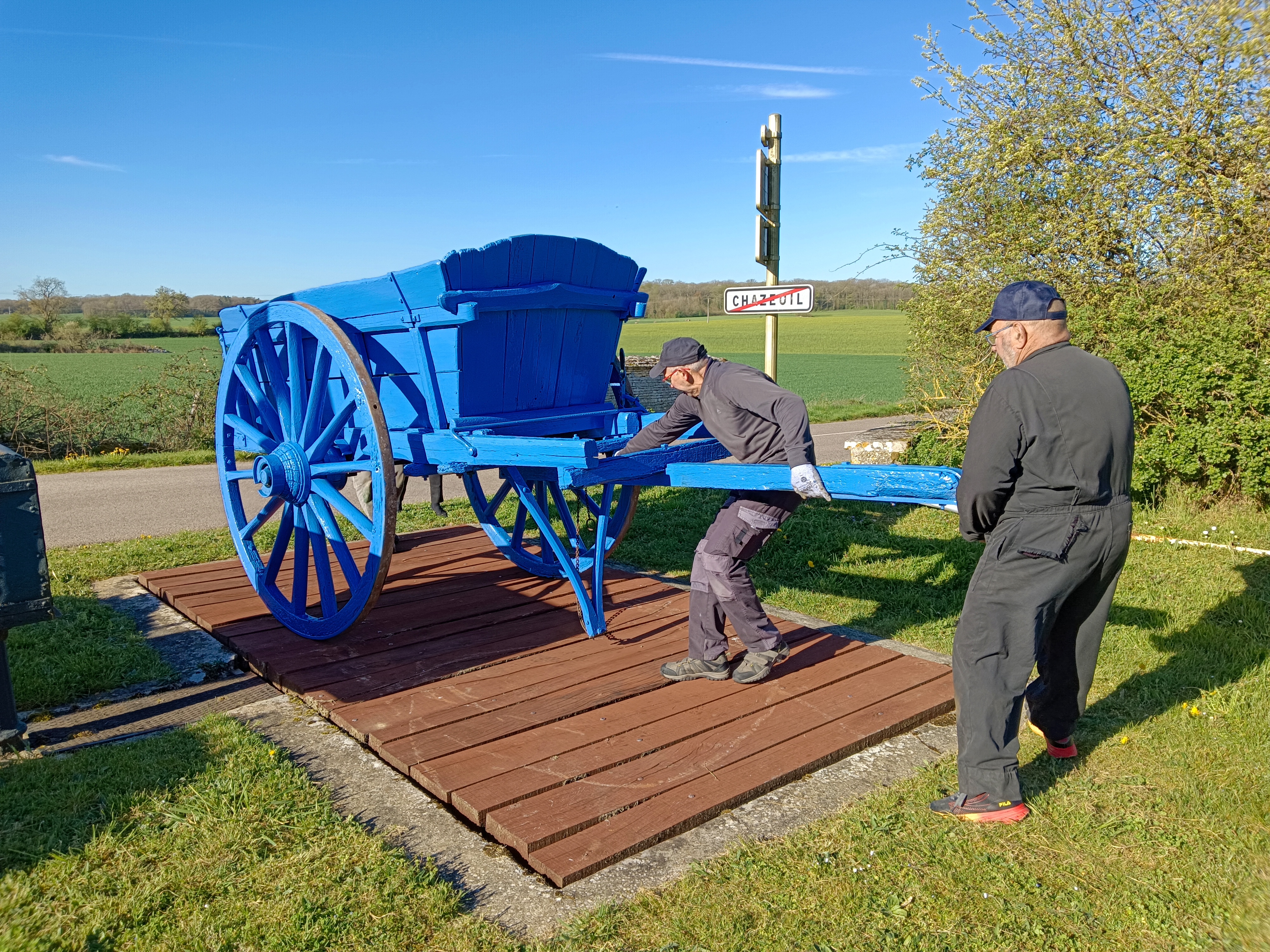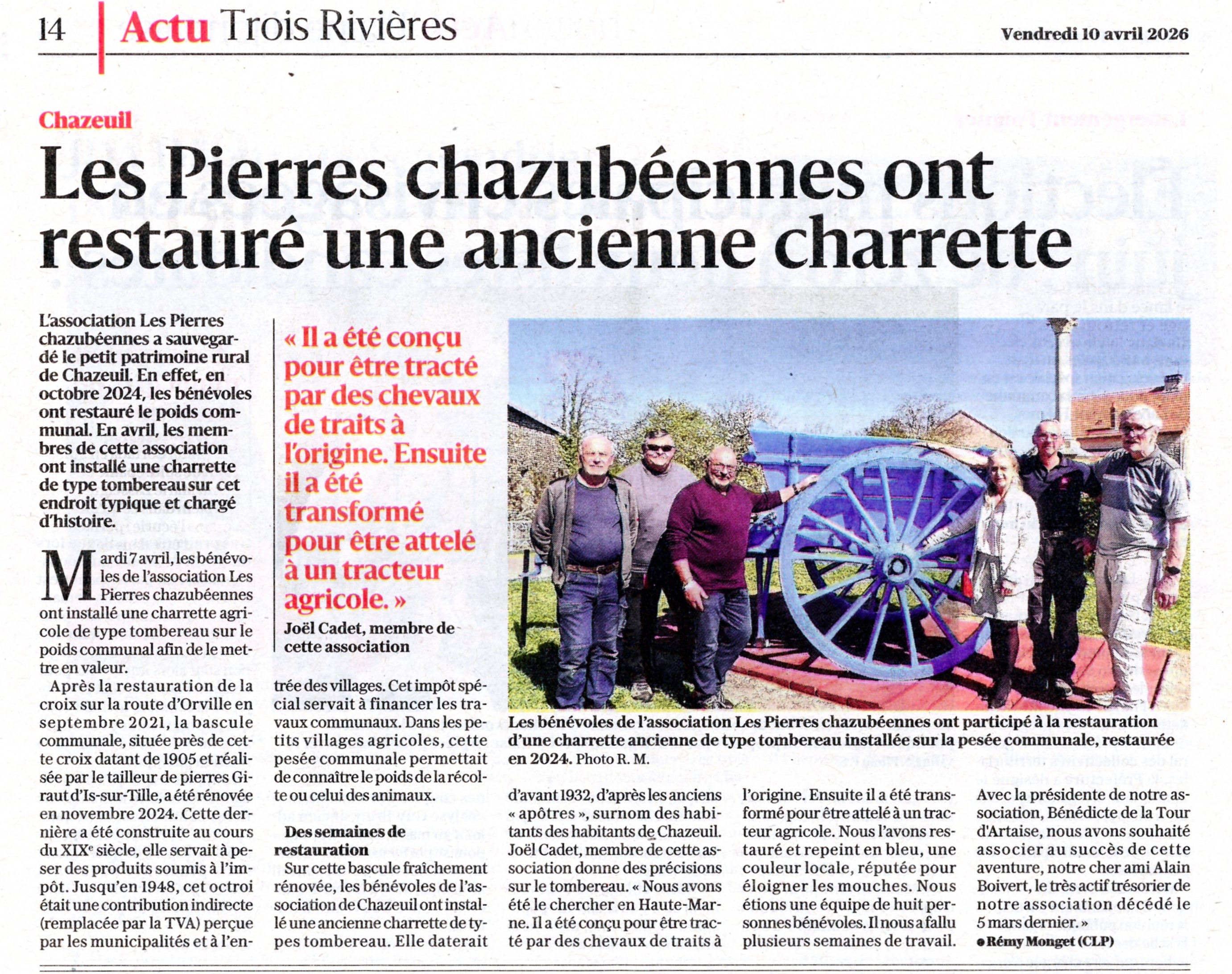 Après plusieurs semaines de travail passionné, les bénévoles de l'association Les Pierres Chazubéennes sont fiers de vous annoncer la mise en place du tombereau restauré sur le poids communal.