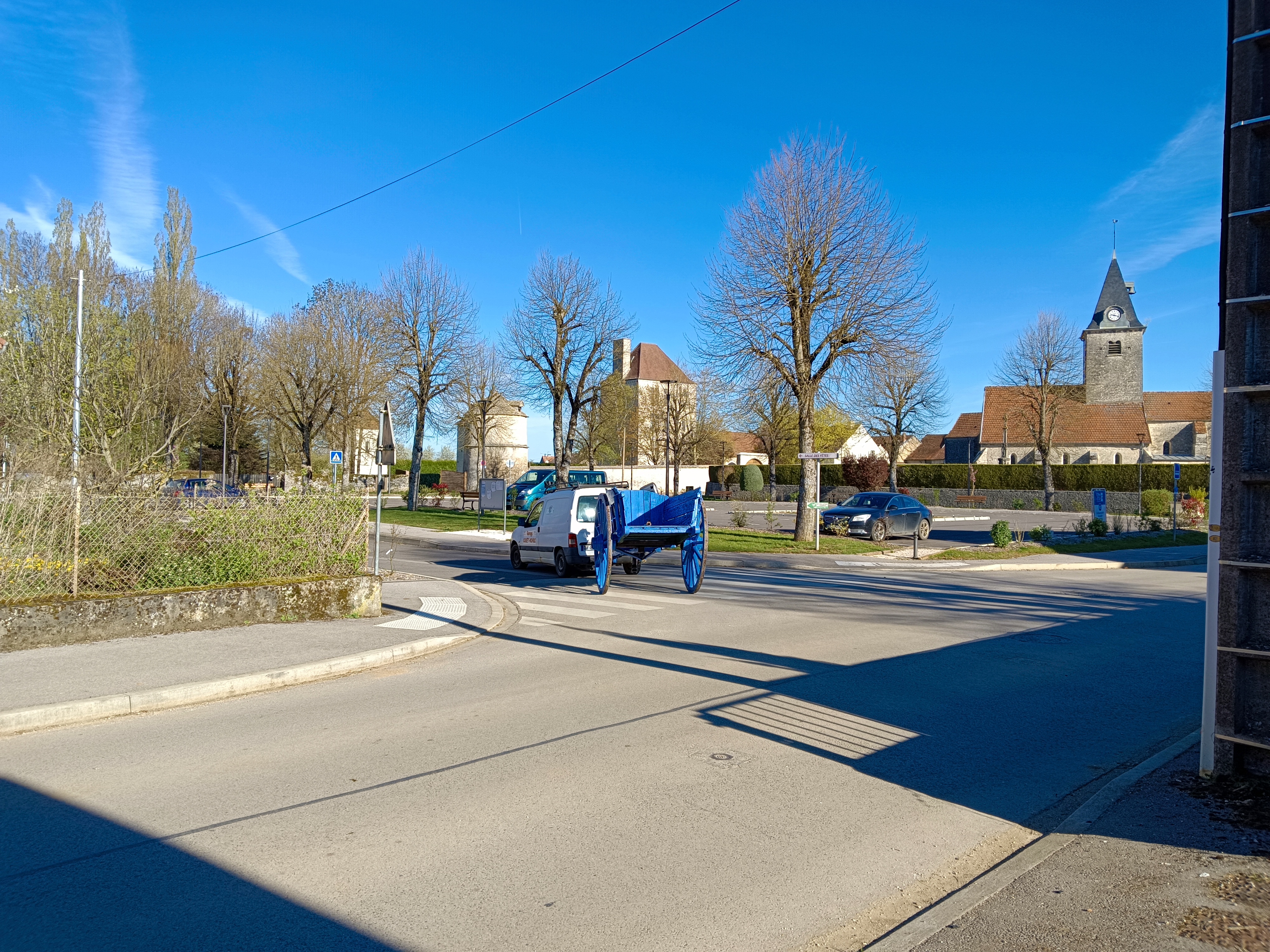 Ce tombereau récupéré en Haute-Marne était à l'origine conçu pour être tracté par des chevaux de trait, l'engin avait été transformé au fil du temps pour être attelé à un tracteur agricole. Pour sa mise en valeur, nous avons choisi de le revêtir d'une robe bleue : une teinte locale traditionnelle autrefois réputée pour sa capacité à éloigner les mouches.